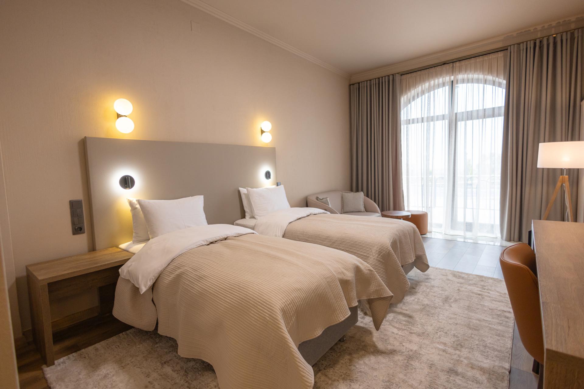 An upgraded room with a balcony and stunning views of the mountains and vineyards. For your choice: double bed or two twin beds.